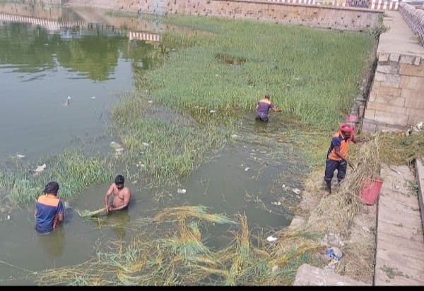 திருப்பரங்குன்றம்: தினமலர் செய்தி எதிரொலியாக திருப்பரங்குன்றம் தெப்பக் குளத்தில் துாய்மைப் பணி நடக்கிறது.