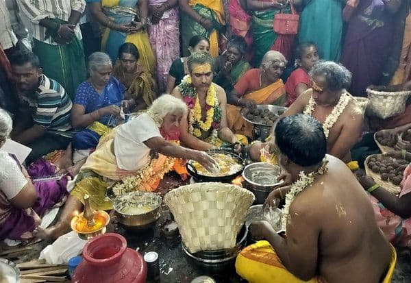 பின்னர் அம்மனை வணங்கி விறகு அடுப்பில் நெய் கொதித்த நிலையில் கருப்பட்டி, அரிசி மாவு கலந்த அப்ப உருண்டைகளை மிதக்க விட்டு அதனை கையால் எடுத்து பனை ஓலை பட்டியில் சேகரித்தார். அவருக்கு உதவியாக கோயில் பூசாரிகள் சுந்தர மகாலிங்கம், இருளப்பன், முருகன் உடனிருந்தனர்.