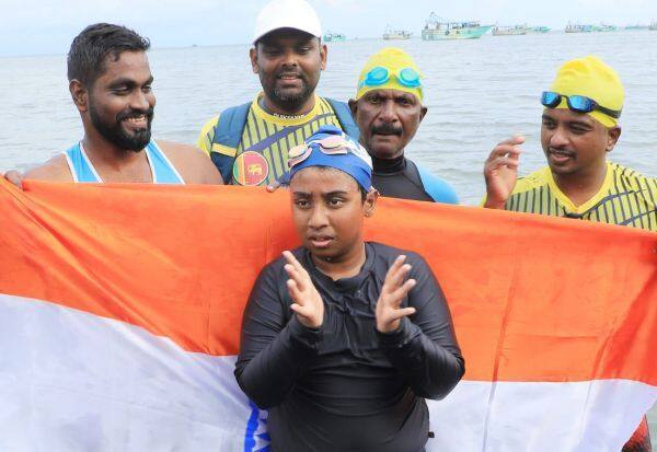நேற்று மாலை 3:20 மணிக்கு ராமேஸ்வரம் கோவில் அக்னி தீர்த்த கடற்கரைக்கு வந்து சேர்ந்தார். இவர் 56 கி.மீ.,யை 22 மணி நேரம் 20 நிமிடங்களில் நீந்தி கடந்து சாதனை படைத்தார்.