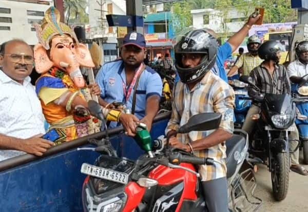விநாயகர் வேடமணிந்த நாடக கலைஞர்கள், வாகனத்தில் பெட்ரோல் நிரப்பினர். இந்த தகவலை கேள்விப்பட்டு, ஏராளமான வாகன ஓட்டிகள் தலையில் ஹெல்மெட் அணிந்தபடி வந்து, பெட்ரோல் போட வரிசையாக அணிவகுத்து நின்றனர். 'பாதுகாப்பான பயணத்தை உறுதி செய்வதே, தங்கள் குறிக்கோள்' என, கிங்ஸ் ரோட்டரி கிளப் நிர்வாகிகள் தெரிவித்தனர்.