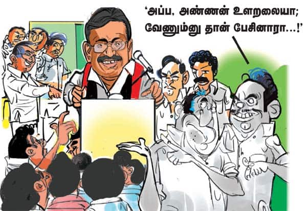 இதை கவனித்த கட்சி நிர்வாகி ஒருவர், 'அப்ப, அண்ணன் உளறலையா... வேணும்னு தான் பேசினாரா...' என முணுமுணுக்க, மற்றொரு நிர்வாகி, 'அமைச்சர் பதவி போயிடுச்சி... இனி, போறதுக்கு ஒண்ணுமில்லைனு, நம்ம தல பேச்சுல, 'தில்'ல பாத்தியா...' என, பெருமை பேசியபடி நடந்தார்.