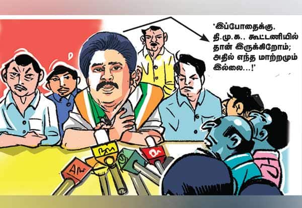 அதற்கு அவர், 'இப்போதைக்கு, தி.மு.க., கூட்டணியில் தான் இருக்கிறோம்; அதில் எந்த மாற்றமும் இல்லை' என்றார்.