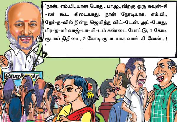 அப்போது அவர் பேசுகையில், 'நான், எம்.பி.,யான போது, பா.ஜ.,விற்கு ஒரு கவுன்சிலர் கூட கிடையாது. நான் நேரடியாக, எம்.பி., தேர்தலில் நின்று ஜெயித்து விட்டேன். அப்போது, பிரதமர் வாஜ்பாயிடம் சண்டை போட்டு, 1 கோடி ரூபாய் நிதியை, 2 கோடி ரூபாயாக வாங்கினேன்.