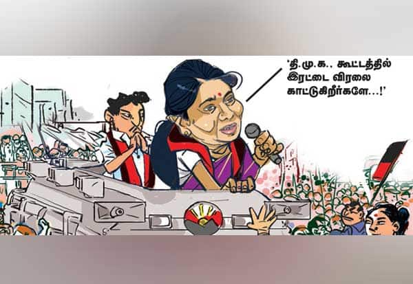 உடனே கனிமொழி, 'தி.மு.க., கூட்டத்தில் இரட்டை விரலை காட்டுகிறீர்களே' என்றார். உடனே, கூட்டத்தினர் ஐந்து விரலை காண்பித்தனர்.