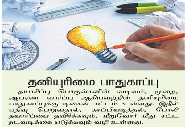 தயாரிப்பு பொருள்களின் வடிவம், முறை, ஆபரண வார்ப்பு ஆகியவற்றின் தனியுரிமை பாதுகாப்புக்கு டிசைன் சட்டம் உள்ளது. இதில் பதிவு பெறுவதால், காப்பியடித்தல், போலி தயாரிப்பை தவிர்க்கவும், மீறுவோர் மீது சட்ட நடவடிக்கை எடுக்கவும் வழி உள்ளது.
