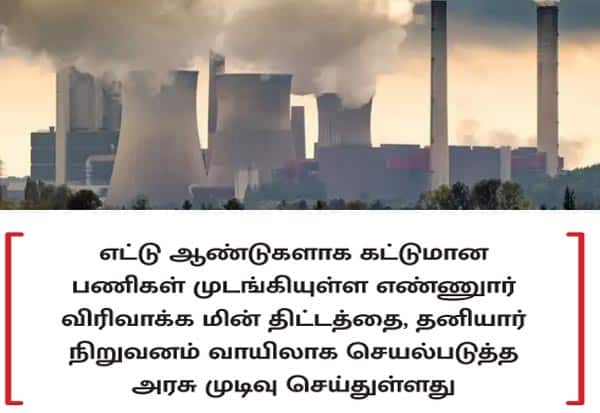 திட்ட செலவு, 4,442 கோடி ரூபாய். அந்நிறுவனம் ஓராண்டுக்குள் பணிகளை துவக்காததால், ஒப்பந்த ஆணை ரத்து செய்யப்பட்டது. எட்டு ஆண்டுகளாக கட்டுமான பணிகள் முடங்கியுள்ள எண்ணுார் விரிவாக்க மின் திட்டத்தை, தனியார் நிறுவனம் வாயிலாக வடிவமைப்பு, கட்டுமானம், நிதி, இயக்குதல் என்ற அடிப்படையில், ஒப்பந்த நிறுவனமே தன் செலவில் அமைத்து, நடத்தும் வகையில் செயல்படுத்த , அரசு முடிவு செய்துள்ளது.