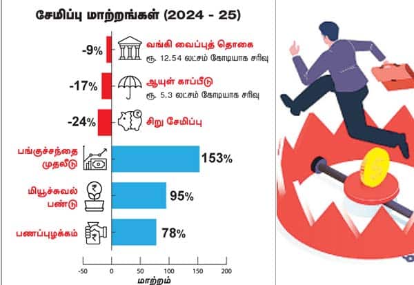 கடந்த நான்கு ஆண்டுகளில் குடும்பங்களின் மொத்த சேமிப்பில் வங்கிகளின் பங்கு 40.90 சதவீதத்திலிருந்து 35.20 சதவீதமாக குறைந்துள்ளது. அதேநேரம், மியூச்சுவல் பண்டுகளில் முதலீடு 2.10 சதவீதத்திலிருந்து 13.10 சதவீதமாக உயர்ந்துள்ளது.
