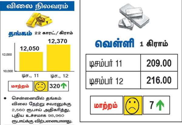 சென்னையில் தங்கம் விலை நேற்று சவரனுக்கு 2,560 அதிகரித்து புதிய உச்சமாக 98,980 ரூபாய்க்கு விற்பனையானது.