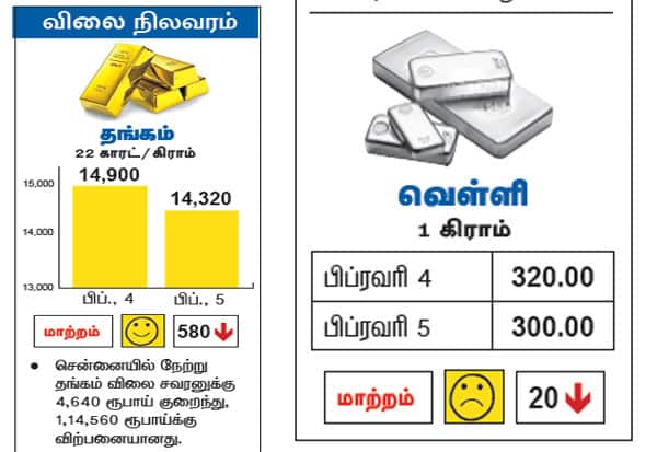 சென்னையில் நேற்று தங்கம் விலை சவரனுக்கு 4,640 ரூபாய் குறைந்து, 1,14,560 ரூபாய்க்கு விற்பனையானது.