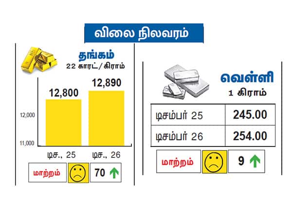 சென்னையில் தங்கம் விலை நேற்று (டிச.,26) சவரனுக்கு 560 ரூபாய் அதிகரித்து, புதிய உச்சமாக சவரன் 1,03,120 ரூபாய்க்கு விற்பனையானது.