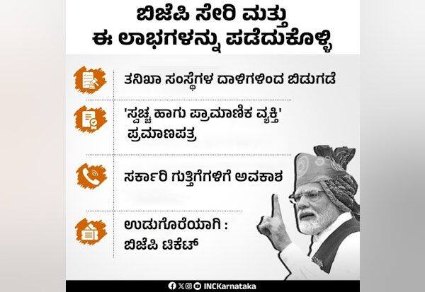 அதில், 'பா.ஜ.,வில் இணைந்து, புலனாய்வு சோதனைகளில் இருந்து விடுவிக்கப்படுங்கள், 'சுத்தமான, நேர்மையான நபர்' என்ற சான்றிதழ் பெறுங்கள், அரசாங்க ஒப்பந்தங்களுக்கான வாய்ப்பு ஆகியவற்றை பரிசாக பெறுங்கள்' என்று கூறப்பட்டுஉள்ளது.