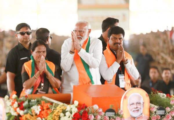 திறந்த வாகனத்தில், ஷிவமொகா வேட்பாளர் ராகவேந்திரா, தாவணகெரே வேட்பாளர் காயத்ரி சித்தேஸ்வர் ஆகியோருடன் மைதானத்துக்குள் வந்தார்.