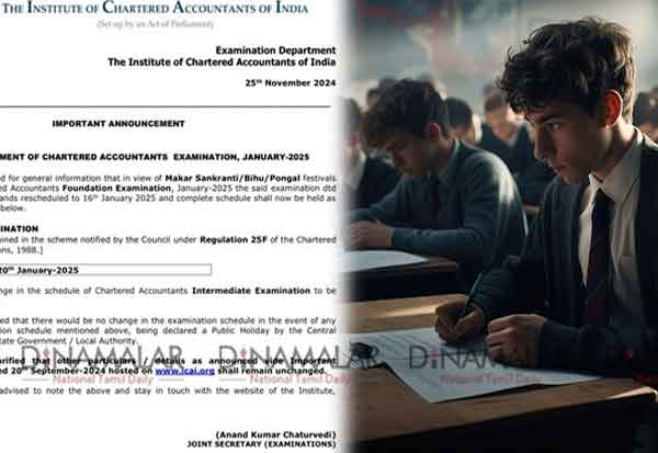 பொங்கல் பண்டிகை தினமான ஜனவரி 14 மற்றும் 16ம் தேதிகளில், 'சி.ஏ' தேர்வுகள் அறிவிக்கப்பட்டு இருந்தது. பொங்கல் திருவிழா என்பது, தமிழகத்தின் தனித்துவமிக்க பண்பாட்டு திருவிழா. இதை கருத்தில் வைத்து, தேர்வர்களுக்கு சிரமமின்றி தேர்வு அட்டவணையை மாற்றி அமைக்க வேண்டும் என கோரிக்கை வலுத்தது. பொங்கல் அன்று தேர்வு தேதியை மத்திய அரசு உடனே மாற்ற வேண்டும் என எதிர்க்கட்சியினர் கண்டனம் தெரிவித்தனர்.