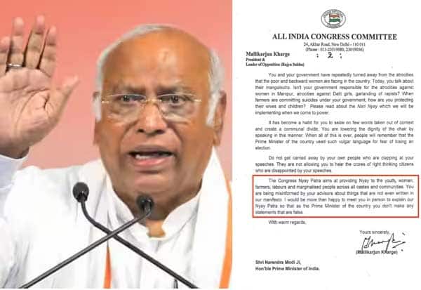 கடிதத்தில் கார்கே கூறியிருப்பதாவது: காங்கிரஸ் தேர்தல் அறிக்கையை நேரில் விளக்கத் தயாராக உள்ளேன். தன்னை சந்திக்க நேரம் ஒதுக்க வேண்டும். காங்கிரஸ் தேர்தல் அறிக்கையில், பெண்கள், இளைஞர்கள் மற்றும் விவசாயிகள் பலன் பெறும் வகையில் பல்வேறு திட்டங்கள் உள்ளன. காங்கிரஸ் தேர்தல் அறிக்கையில் குறிப்பிடாத அம்சங்களை பிரதமரின் ஆலோசகர்கள் அவருக்கு கூறியுள்ளனர்.