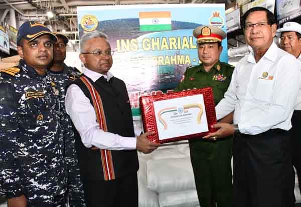இந்நிலையில், அரிசி, சமையல் எண்ணெய், நூடுல்ஸ் மற்றும் பிஸ்கட்டுகள் என 442 மெட்ரிக் டன் உணவுப் பொருட்களை இந்தியா மியான்மருக்கு அனுப்பி வைத்துள்ளது. இந்த உதவிப் பொருட்களை ஏற்றிக் கொண்டு, இந்திய கடற்படைக்கு சொந்தமான ஐ.என்.எஸ்., காரியல் கப்பல், திலவா துறைமுகத்திற்கு சென்றடைந்தது. பின்னர், அந்நாட்டு அதிகாரிகளிடம் ஒப்படைக்கப்பட்டது.