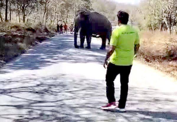அப்போது பண்டிப்பூரில், உணவு தேடி காட்டு யானை ஒன்று, சாலையில் நின்றிருந்தது. இதை பார்த்த நண்பர்கள், வாகனத்தை நிறுத்தினர். இவர்களில் ஹமீது என்பவர் மட்டும், காரில் இருந்து இறங்கி, யானை அருகில் சென்று கூச்சலிட்டார்.