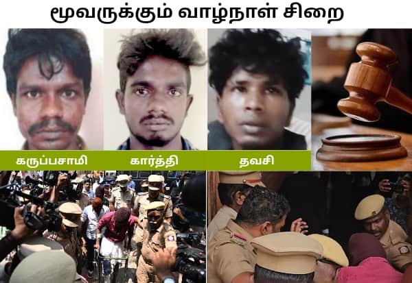 பிப்., 23 ல் சாட்சி விசாரணை நிறைவு பெற்றது. பிப்., 24 ல் அரசு தரப்பு வக்கீல் ஜிஷா, இறுதி வாதத்தை முன்வைத்தார். எதிர் தரப்பில் இலவச சட்ட உதவி மைய வக்கீல்கள் வாதிட்டனர். இரு தரப்பு வாதம் முடிந்ததையடுத்து, இன்று தீர்ப்பளிக்கப்பட்டது. கைது செய்யப்பட்ட 3 பேரும் குற்றவாளிகள் என நீதிபதி சுந்தரராஜ் அறிவித்தார். அதன்படி மதியம் 3 மணி அளவில் தண்டனை விபரங்களை அவர் வெளியிட்டார். குற்றவாளிகள் 3 பேருக்கும் சாகும் வரை ஆயுள் தண்டனை விதிப்பதாக நீதிபதி சுந்தரராஜ் அறிவித்தார்.