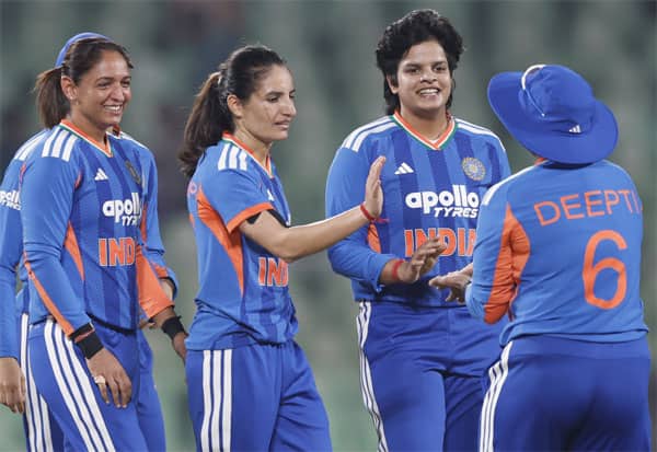 இதனையடுத்து களமிறங்கிய இலங்கை அணி, இந்திய அணியின் பந்துவீச்சை சமாளிக்க முடியவில்லை. அந்த அணி வீராங்கனைகள் அடுத்தடுத்து அவுட் ஆனார்கள். அதிகபட்சமாக இமேஷா துலானி 27, துவக்க வீராங்கனை ஹசினி பெரேரா 25, கவிஷா தில்ஹரி 20 ரன் எடுத்தனர். மற்ற வீராங்கனைகள் சமரி அதபத்து 3, சமரவிக்ரமா 2, நிகஷிகா சில்வா2, மல்ஷா 5 ரன் எடுக்க அந்த அணி 20 ஓவரில் 7 விக்கெட் இழப்புக்கு 112 ரன் எடுத்தது. இந்திய அணியின் ரேணுகா சிங் 4, தீப்தி சர்மா 3 விக்கெட் வீழ்த்தினர். இன்று 3 விக்கெட் வீழ்த்தியதன் மூலம் டி20 போட்டிகளில் 150 விக்கெட் கைப்பற்றி சாதனை படைத்தார்.
