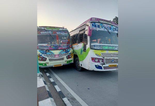 தொடர்ந்து இரண்டு பஸ்களையும் பறிமுதல் செய்து, வழக்குப் பதிந்து விசாரித்து வருகின்றனர். விபத்து காரணமாக சர்வீஸ் சாலையை கடந்து செல்ல முடியாமல் நீண்டதுாரம் வாகனங்கள் அணி வகுத்து நின்றன. இதனால் 30 நிமிடம் போக்குவரத்து பாதித்தது.