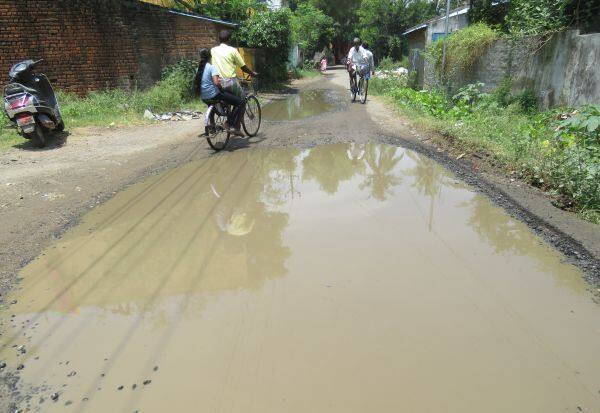 வாகன போக்குவரத்து அதிகம் உள்ள இச்சாலை, மழை காரணமாக மண் அரிப்பு ஏற்பட்டு சாலையில் பள்ளம் ஏற்பட்டுள்ளது. இதனால், சாலை சேதமடைந்த பகுதியில் மழைநீர் குட்டைபோல தேங்குகிறது.