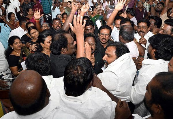 தொடர்ந்து அ.தி.மு.க., கவுன்சிலர்கள், மேயரை நோக்கி சென்றனர். அவர்களை தி.மு.க., கவுன்சிலர்கள் தடுத்து வாக்குவாதம் செய்தனர். இரு தரப்பினர் இடையே தள்ளுமுள்ளு ஏற்பட்டது.