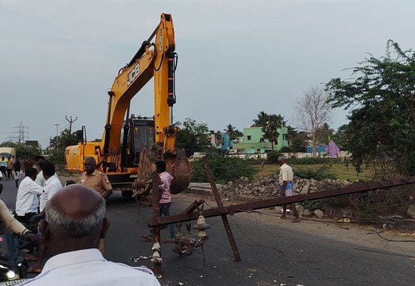 நேற்று மாலை 5:30 மணிக்கு டிப்பர் லாரி சாலை நடுவே மண் கொட்டிய போது டிப்பர் மின் கம்பியில் சிக்கியதில் கம்பம் உடைந்து சாலை நடுவே விழுந்தது.