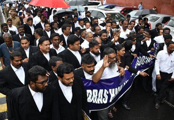 சென்னை உயர் நீதிமன்ற வழக்கறிஞர்கள் சங்க தலைவர் ஜி.மோகனகிருஷ்ணன், 'லா அசோசியேஷன்' தலைவர் செல்வராஜ், பெண் வழக்கறிஞர்கள் சங்கம் என, அனைத்து வழக்கறிஞர் சங்கங்களின் சார்பில், நேற்று மாபெரும் ஆர்ப்பாட்டம் நடந்தது.