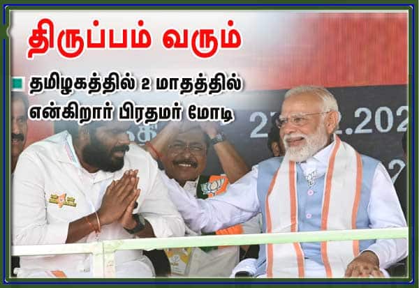 மோடி பேசியதாவது: தமிழகத்தின் கொங்கு பகுதி, நாட்டின் வளர்ச்சி பாதையில் முக்கிய பங்காற்றுகிறது. இங்கு, ஜவுளித்தொழில் துடிப்பாக உள்ளது. காற்றாலை மின் உற்பத்தியில் மிகப்பெரிய பங்காற்றுகிறது. தொழில் முனைவோருக்கு உறுதுணையாக இருக்கிறது. இந்தக் கூட்டத்தை பார்க்கும் போது, காவிக்கடலைப் பார்த்தது போல இருக்கிறது; தமிழகம் தேசியத்தின் பக்கம் இருக்கிறது என்ற நம்பிக்கை உறுதியாகிறது.தமிழகம், இந்தியாவின் முதன்மை மாநிலமாக மாறும். இங்கே அதிகம் பேசப்படும் கட்சியாக, பா.ஜ., மாறியுள்ளது. நாட்டின் அரசியல் வளர்ச்சியில், தமிழகம் புதிய மையமாக மாறிக் கொண்டிருக்கிறது. 2024 தேர்தலில் புதிய சரித்திரம் படைக்க இருக்கிறது. அதற்கு முன்னோடியாக, 'என் மண்; என் மக்கள்' யாத்திரை அமைந்திருக்கிறது.