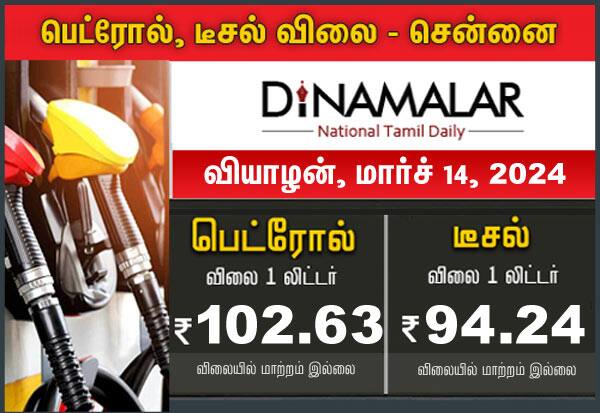 சென்னை: சென்னையில் பெட்ரோல், டீசல் விலை மாற்றம் இல்லாமல், இன்று (மார்ச் 14) பெட்ரோல் 102.63 ரூபாய்க்கும், டீசல் 94.24 ரூபாய்க்கும் விற்பனையாயின.