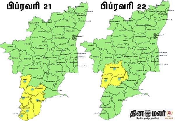 தென் தமிழகம் மற்றும் தெற்கு கேரள பகுதிகளின் மேல் ஒரு வளிமண்டல மேலடுக்கு சுழற்சி நிலவுகிறது. இதன் காரணமாக, கன்னியாகுமரி, திருநெல்வேலி, தூத்துக்குடி, தென்காசி, விருதுநகர் மற்றும் தேனி ஆகிய 6 மாவட்டங்களில் நாளை (பிப்ரவரி 21) ஓரிரு இடங்களில் இடி, மின்னலுடன் கூடிய கனமழை பெய்யக்கூடும். தென் தமிழகத்தில் ஒருசில இடங்களிலும், வட தமிழகத்தில் ஓரிரு இடங்களிலும் நாளை மறுநாள் (பிப்ரவரி 22 ) லேசானது முதல் மிதமான மழை பெய்யக்கூடும்.