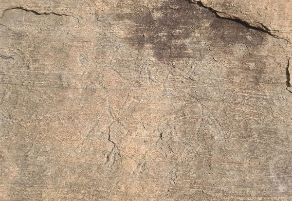 அருகில், இரு கொம்புகளுடன் உள்ள ஒரு மனித உருவம், குதிரையின் மீது சவாரி செய்யும் மனிதனும், பாறை செதுக்கல்களாக உள்ளன.