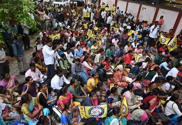 அலுவலக நுழைவு வாயிலில் அமர்ந்து கோஷம் எழுப்பினர் . அவர்களை போலீசார் குண்டுக்கட்டாக கைது செய்தனர். குழந்தைகள், தங்கள் பெற்றோரை இறுக பற்றிக் கொண்டு கதறி அழுதனர்.