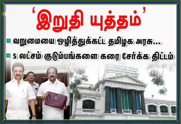 அதை அங்கீகரிக்கும் வகையில், மத்திய அரசின், 'நிடி ஆயோக்' சமீபத்திய அறிக்கையில், தமிழகத்தில் வறுமைக்கோட்டிற்கு கீழே வாழும் மக்களின் சதவீதம் மிகக் குறைவாக, 2.2 சதவீதம் மட்டுமே உள்ளதாக தெரிவித்துள்ளது.அந்த குடும்பங்களையும் கண்டறிந்து, எல்லா வகையிலும் அவர்களின் கஷ்டங்களை போக்கி, மாநிலத்தில் வறுமையை அடியோடு ஒழித்து கட்ட தமிழக அரசு இறுதி யுத்தத்தை துவக்கி உள்ளது.