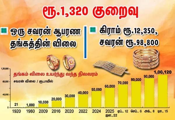 சென்னை: தமிழகத்தில் எப்போதும் இல்லாத வகையில், 22 காரட் ஆபரண தங்கம் விலை நேற்று, 1 லட்சம் ரூபாயை தாண்டி, 1 சவரன் 1,00,120 ரூபாய்க்கு விற்பனையானது. இன்று (டிச 16) தங்கம் விலை சவரனுக்கு ரூ.1320 சரிந்து ஒரு சவரன் ரூ.98,800க்கு விற்பனை செய்யப்பட்டு வருகிறது.
