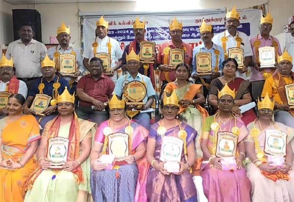 தூத்துக்குடி மாவட்டத்தில் பணி நிறைவு பெற்ற 23 தலைமையாசிரியர்களுக்கு பாராட்டு விழா -கோவில்பட்டி அரசு மகளிர் தகைசால் மேல்நிலைப்பள்ளியில் நடைபெற்ற நிறைவு விழாவில் ஆசிரியர்கள் தலையில் கிரீடம் வைத்து மேளதாளம் முழங்க ஊர்வலமாக அழைத்து வரப்பட்ட