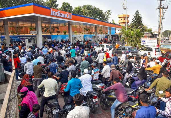 லாரி டிரைவர்கள் போராட்டம் காரணமாக, தட்டுப்பாடு ஏற்படும் என்ற அச்சத்தில் பெட்ரோல் பங்குகளில் குவிந்த வாகன ஒட்டிகள். இடம்: ஹைதராபாத்.