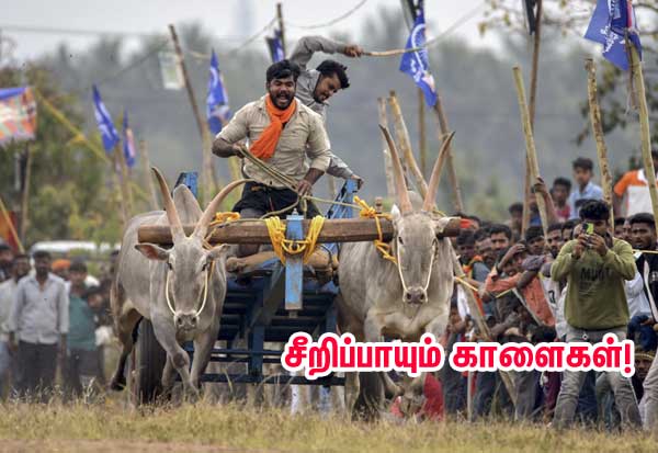 மாட்டு வண்டி பந்தயத்தில் இலக்கை நோக்கி சீறிப்பாயும் காளைகள். இடம்: சிங்கமங்களூரு, கர்நாடகா