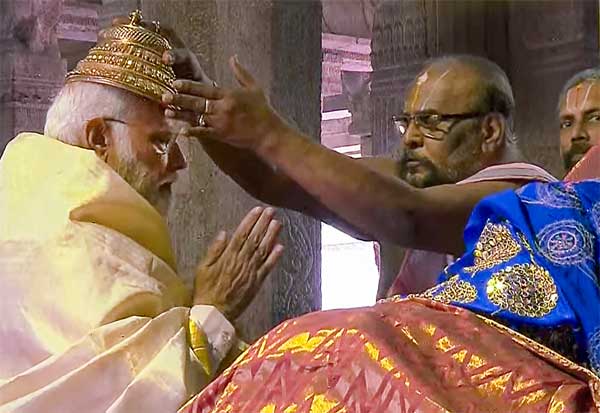 அயோத்தி ராமர் கோயில் கும்பாபிஷேகம் தொடர்பாக 11 நாட்கள் விரதம் மேற்கொண்டுள்ள பிரதமர் மோடி இன்று ஸ்ரீரங்கம் கோயிலுக்கு வந்து தரிசனம் செய்தார். அவருக்கு சடாரி வைத்து ஆசி வழங்கினார் பட்டர்.