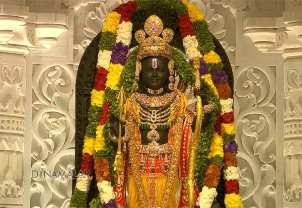 அயோத்தியில் பிராண பிரதிஷ்டை செய்யப்பட்ட ராமர் சிலை. மூலவரான இவர் கருவறையில் உள்ள தோற்றம்.
