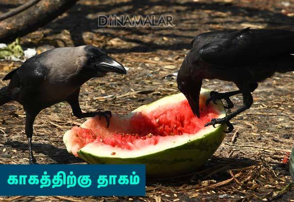 காகத்திற்கு தாகம் தீர்க்க தர்பூசணியை வச்ச புண்ணியவானுக்கு கோடி நன்றி. படம்: சுரேஷ் கண்ணன்.