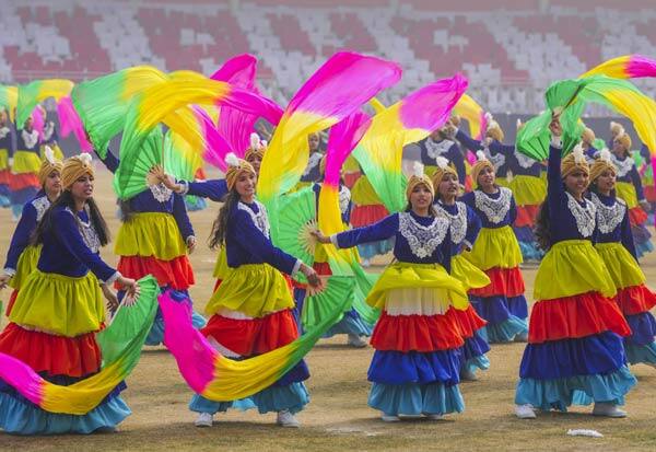 குடியரசு தின விழாவில் நடத்தப்படும் கலைநிகழ்ச்சிக்கான ஒத்திகையில் ஈடுபட்டுள்ள பெண்கள். இடம்: புதுடில்லி
