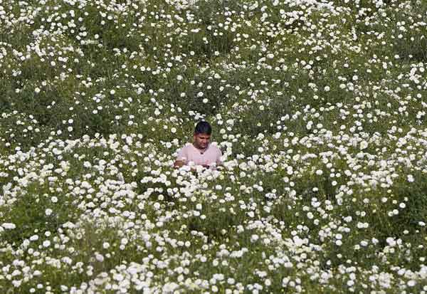 தோட்டத்தில் பூக்களை பறிக்கும் பணியில் விவசாயி. இடம்: அஜ்மீர், ராஜஸ்தான்