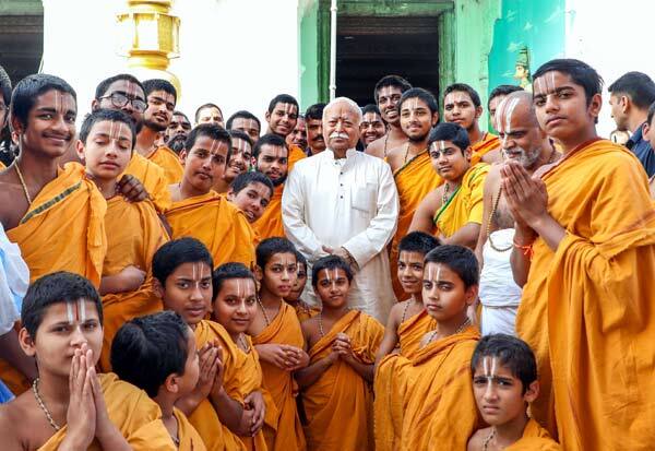 ஆந்திராவில் சின்னா ஜீயர் சுவாமி மடம் வந்த ஆர்.எஸ்.எஸ்., தலைவர் மோகன் பகவத் உடன், சீடர்கள் புகைப்படம் எடுத்துக்கொண்டனர். இடம்: ஹைதராபாத்.