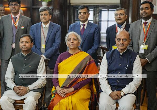2024-25 ம் நிதியாண்டிற்கான இடைக்கால பட்ஜெட்டை, லோக்சபாவில் நாளை (பிப்.,01) மத்திய நிதியமைச்சர் நிர்மலா சீதாராமன் தாக்கல் செய்கிறார். இதனையடுத்து, இணையமைச்சர்கள் பங்கஜ் சவுத்ரி, பக்வத் காரத் மற்றும் நிதியமைச்சக அதிகாரிகளுடன் நிர்மலா சீதாராமன் குரூப் போட்டோ எடுத்துக் கொண்டார். இடம்: புதுடில்லி.