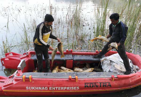 மன்சார் ஏரியில் இறந்து மிதந்த மீன்களை படகுகளில் சேகரித்தனர். இடம்: சம்பா மாவட்டம், ஜம்மு காஷ்மீர்