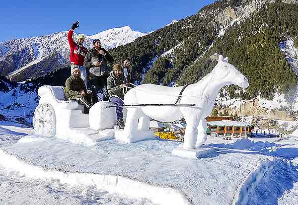 ஜம்மு - காஷ்மீரின் கந்தெர்பால் பகுதியில் பனிக்கட்டிகளை செதுக்கி உருவாக்கப்பட்ட குதிரை வண்டி சிற்பத்தில் அமர்ந்து மகிழ்ந்த சுற்றுலா பயணியர்.