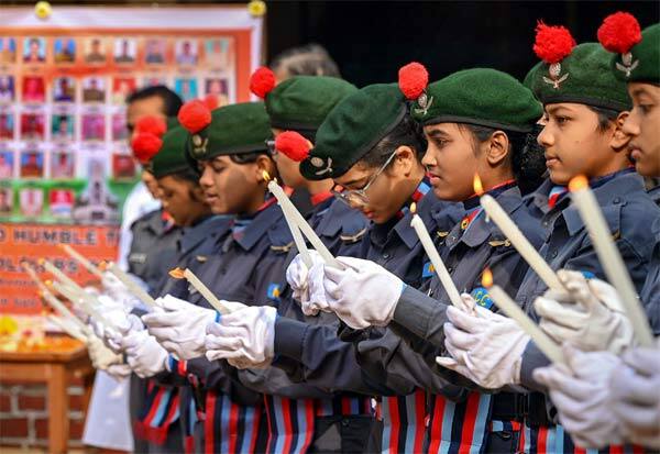 ஜம்மு-காஷ்மீரின் ‛‛புல்வாமா'' தாக்குதல் சம்பவத்தின் 5-ம் ஆண்டு நினைவு தினத்தையொட்டி அஞ்சலி செலுத்திய தேசிய மாணவர் படையினர். இடம்: புவனேஸ்வர், ஒடிசா.