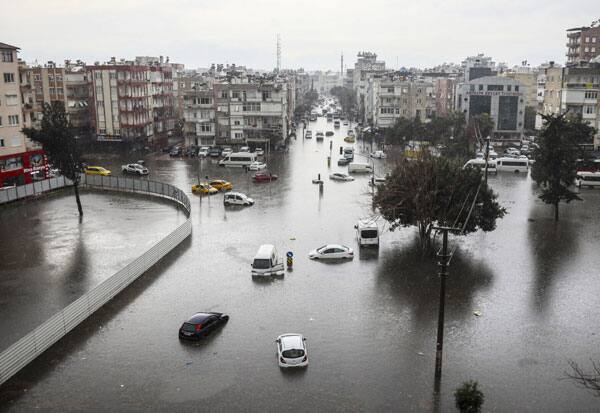 துருக்கியின் அன்டாலியா என்ற பகுதியில் பலத்த மழை காரணமாக வாகனங்கள் மூழ்கி கிடக்கும் காட்சி.
