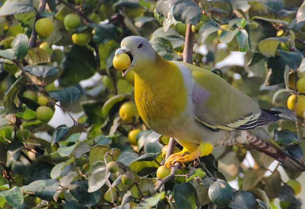 தோட்டத்தில் பழத்தை உண்ணும் புறா. இடம்: நாடியா, மேற்குவங்கம்.