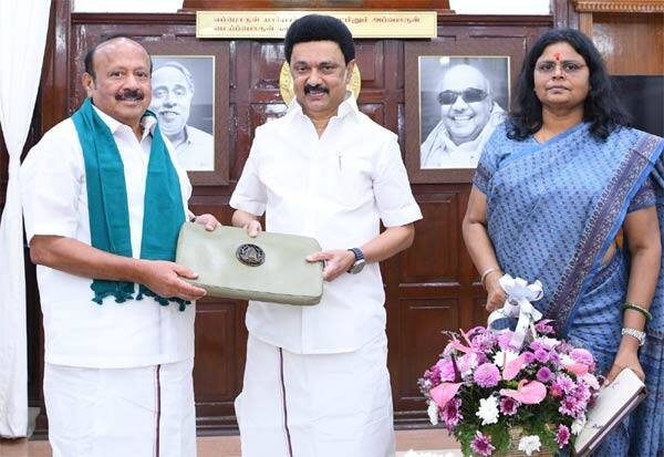 சட்டசபையில் வேளாண் பட்ஜெட்டை தாக்கல் செய்வதற்கு முன்பு, முதல்வர் ஸ்டாலினை சந்தித்து வாழ்த்து பெற்ற அமைச்சர் எம்.ஆர்.கே பன்னீர் செல்வம். இடம்: செ ன்னை
